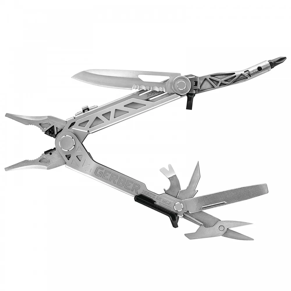 Funkciók: rugós nyitású hegyes fogó, kombinált fogó, drótvágó, egyujjas nyitás, részben recézett penge, központi tengely bit behajtó, mágneses bit, extra bit tartó, vonalzó, üvegnyitó, feszítővas, szöghúzó, ár, reszelő, olló, kereszt-, négyszög-, torx-, lapos, hatszög bitek.