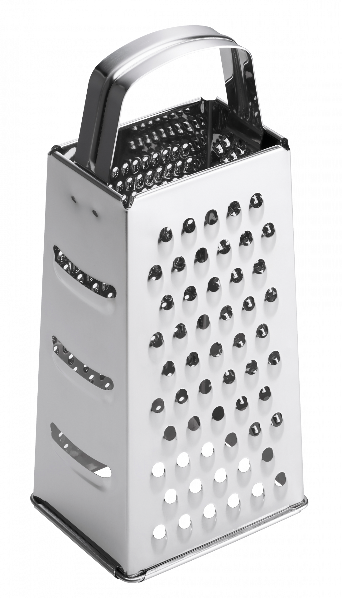 Klasszikus négyszög alakú reszelő az összes hagyományos funkcióval, tetején nagy méretű fogantyúval.