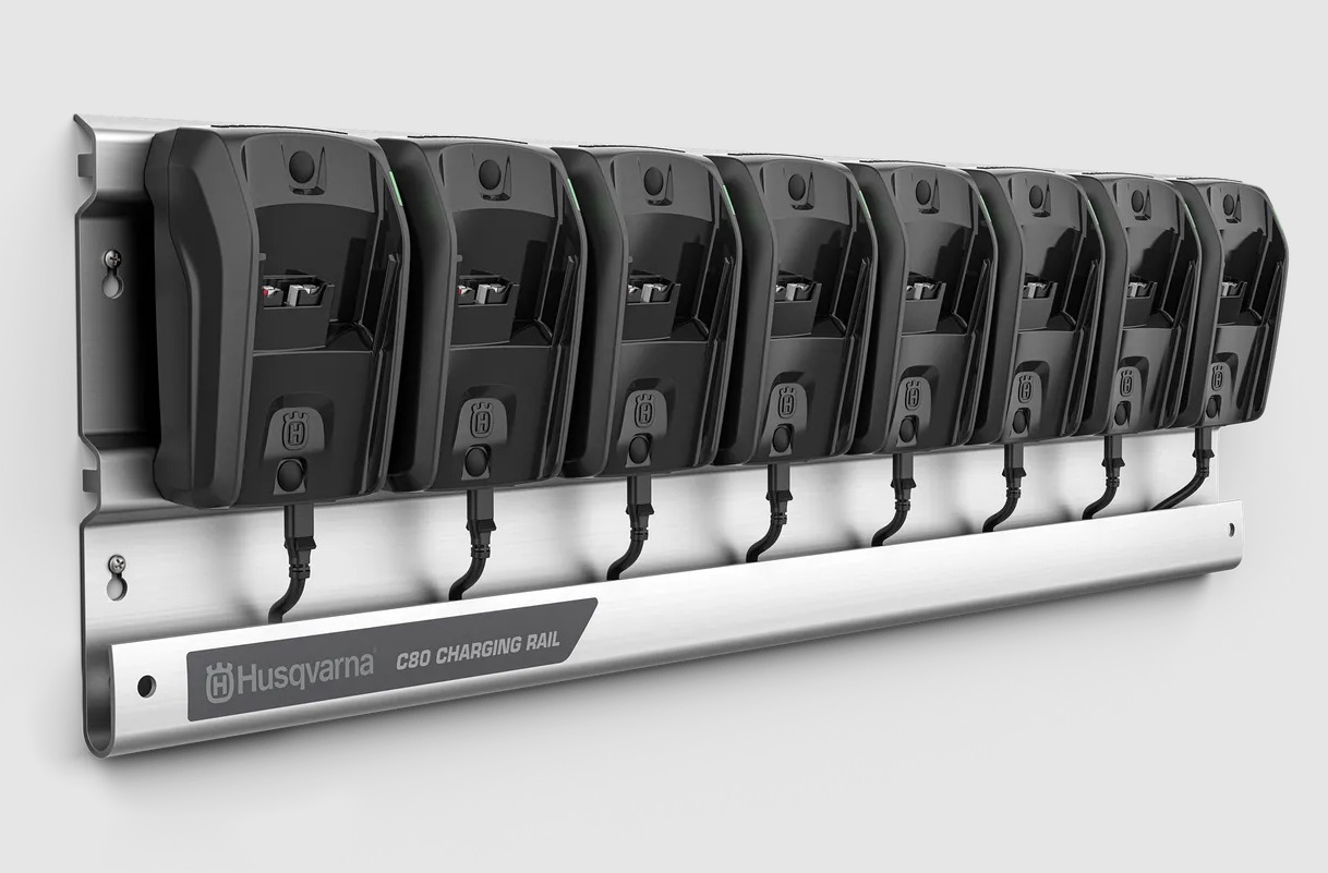 A Husqvarna töltőállomás kényelmes módot kínál akár nyolc Husqvarna BLiX 36 V-os akkumulátor éjszakai töltésére. A töltőállomás a műhely falára szerelhető, hogy helyet takarítson meg, és biztonságosan a helyén tartja C80-as töltőit, összekuszálódott kábelek nélkül. Csendes, mivel a töltés alacsony teljesítmény mellett történik, és nincs szükség hűtőventilátorra. A töltőállomás alumínium sínt, kábelt és nyolc C80-as töltőt tartalmaz. Nem tartalmazza az akkumulátorokat.