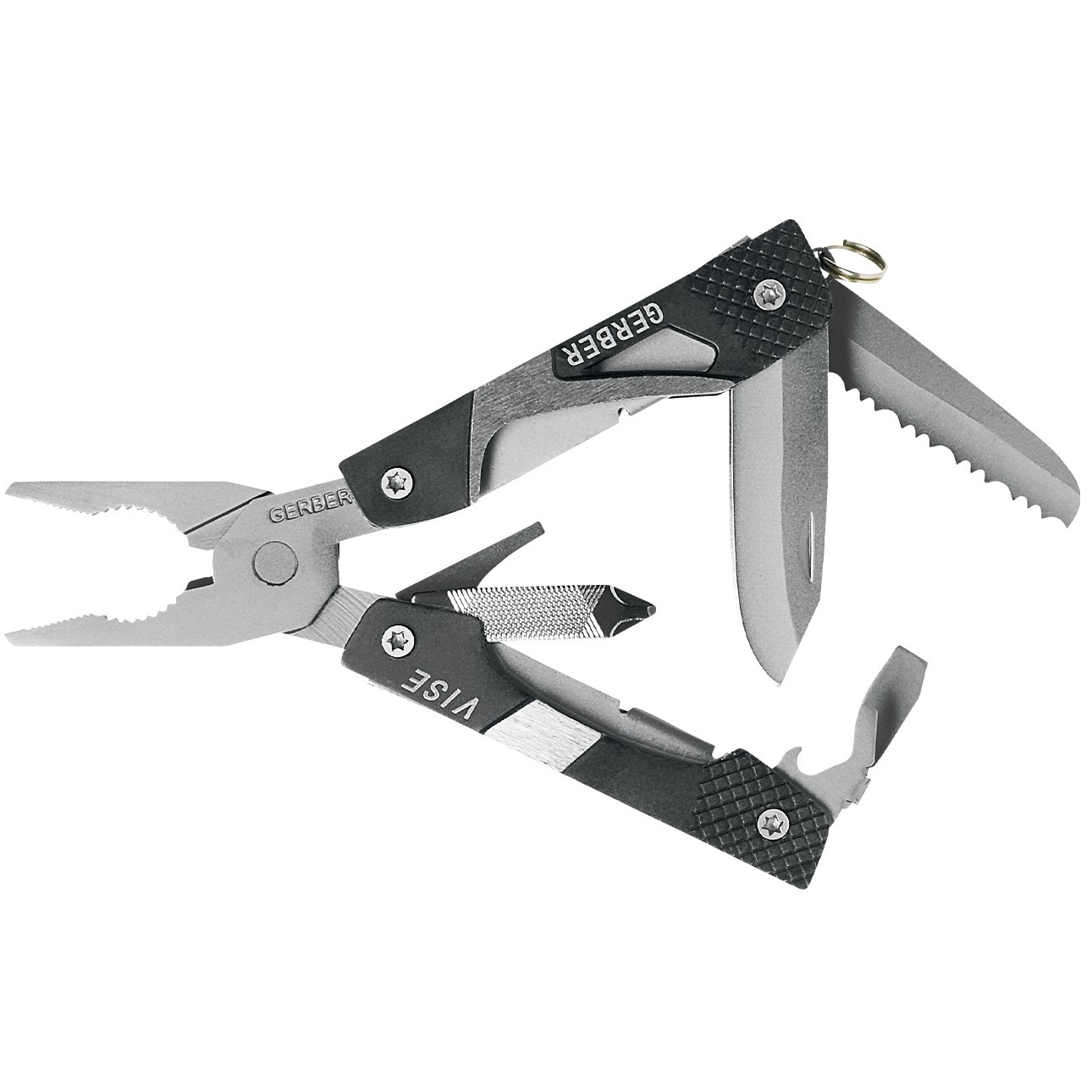 Funkciók: rugós hegyes fogó, drótvágó, üvegnyitó, tartózsinórgyűrű, reszelő Phillips csavarhúzóval, kis laposfejű csavarhúzó, közepes laposfejű csavarhúzó, fogazott penge, sima élű penge.